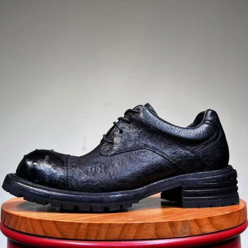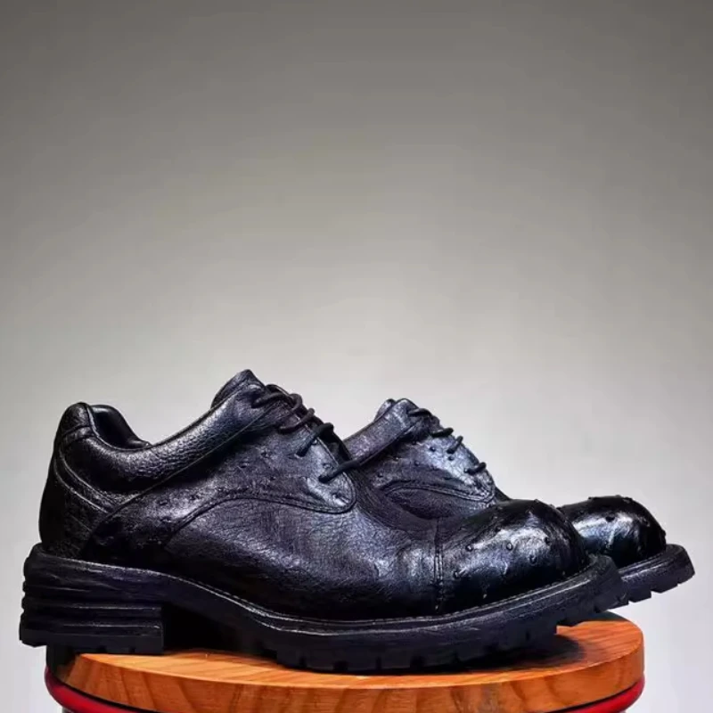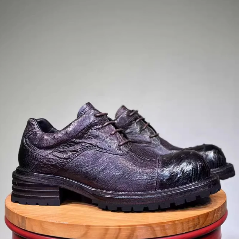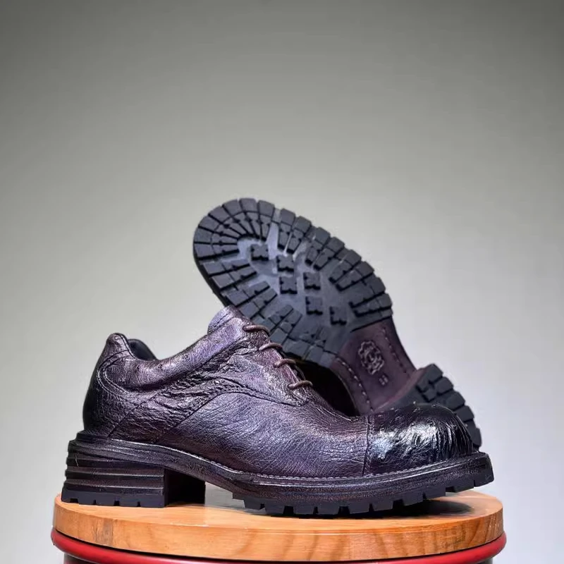 • Ostrich Skin Men’s Dress Derby Shoes for Men Genuine Leather Hand-sewn Comfortable Dark Purple Casual Height Increasing Shoes